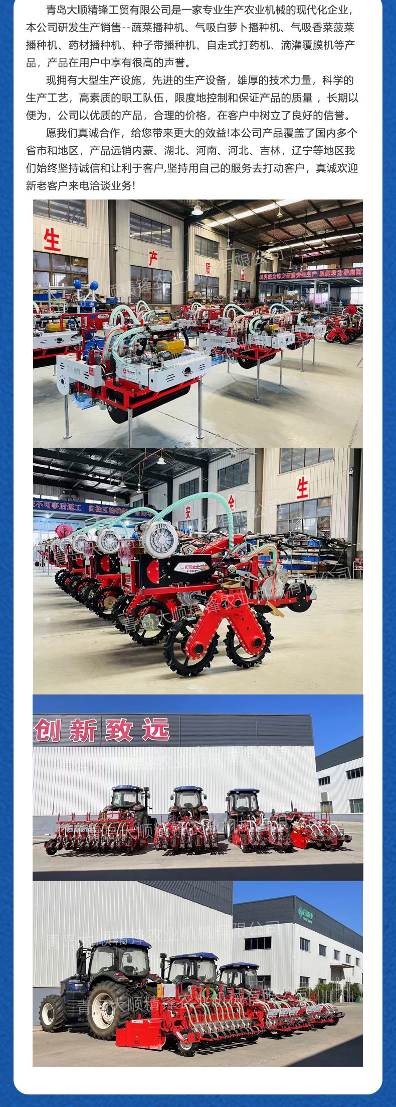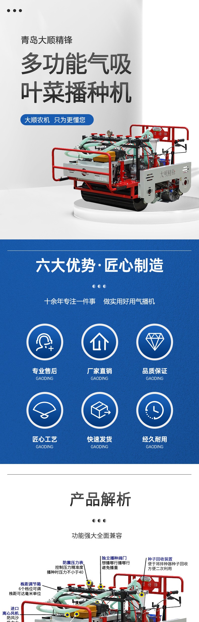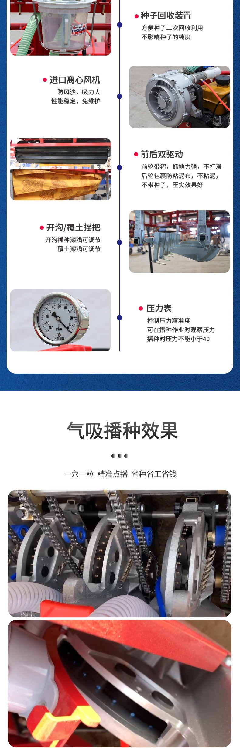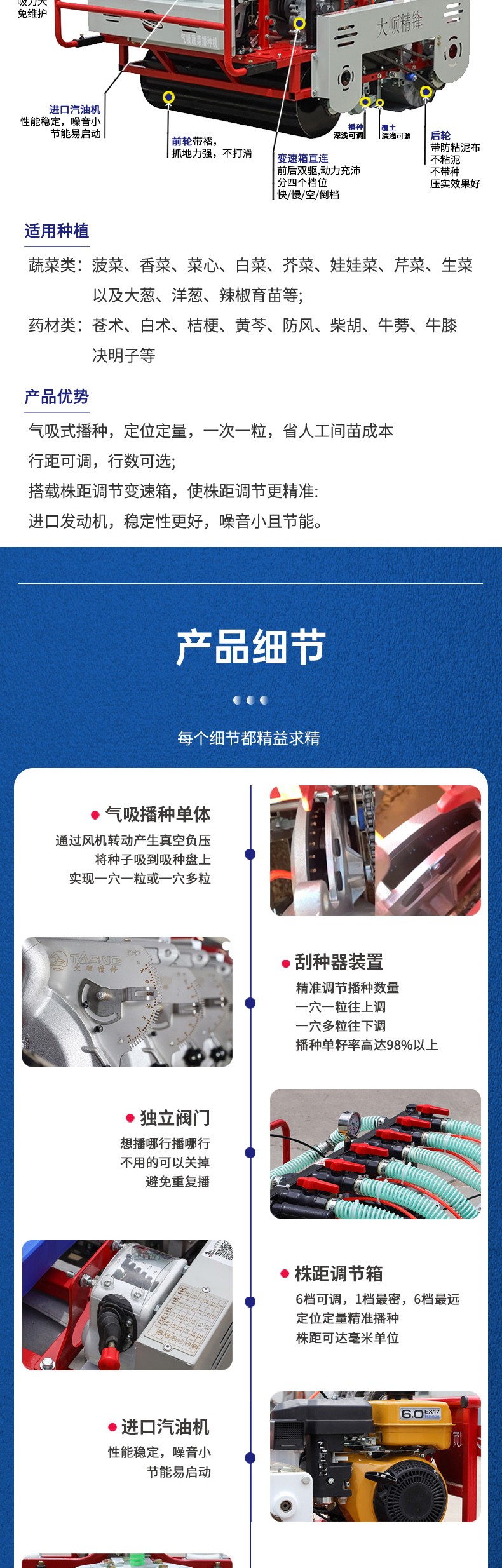 适用作物:白萝卜、青萝卜、白菜、娃娃菜、丸粒胡萝卜、甜菜等小颗粒 优势: 1、精量播种,可以达到一次一粒,准确率高达98%以上 2、株距精准,可调节 3、四驱动力系统,动力强劲